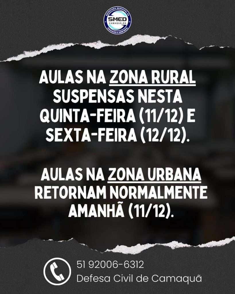 A Prefeitura informa que, devido às condições climáticas, as aulas na zona rural e urbana estão canceladas nessa quarta-feira, dia 10 de dezembro