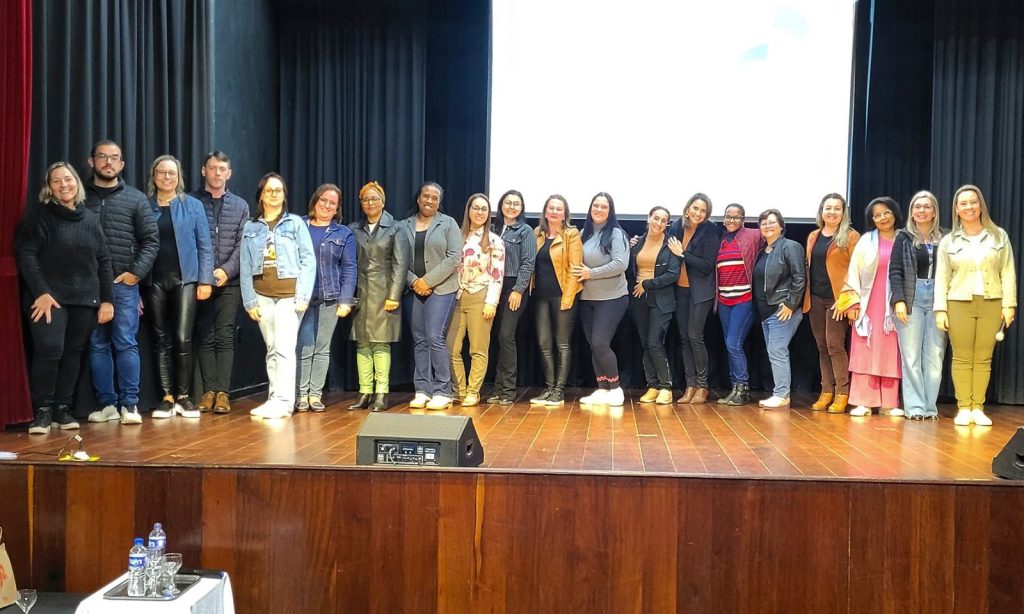 As assessoras pedagógicas Ariadne Suris e Mileni Scherer apresentaram os objetivos e a proposta do núcleo, com a colaboração do IFSul, representado pela professora Roberta Pedroso, o docente Patrick Kovalski e o bibliotecário Tiago Vieira.