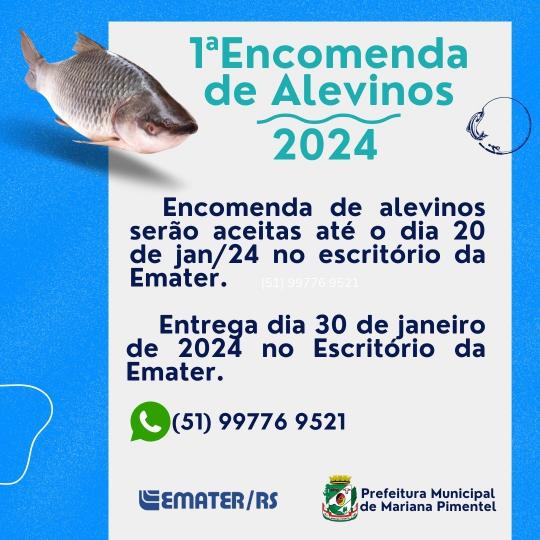 O escritório da Emater/Ascar que fica no município de Mariana Pimentel, junto da Secretaria Municipal da Agricultura (SMA), comunica a todos os interessados na 1ª Encomenda de Alevinos para o ano de 2024 que, o prazo para a solicitação está aberto até o dia (20) de janeiro, sábado.