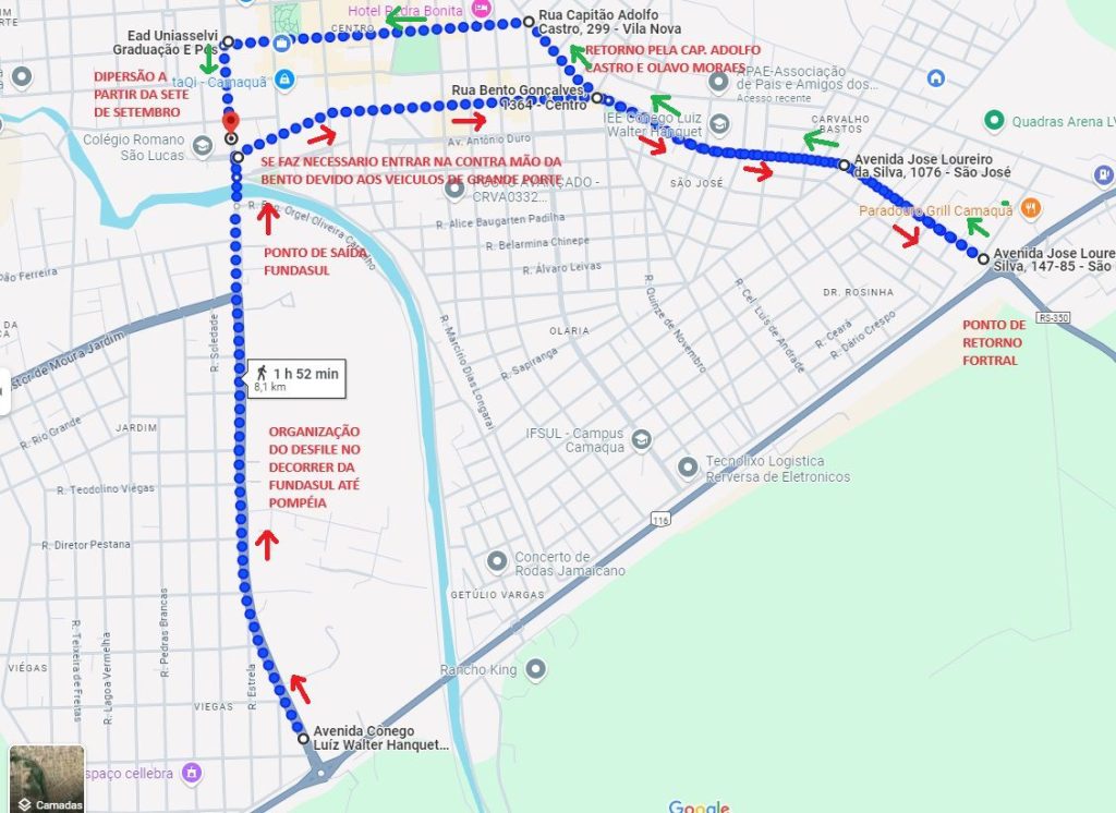 O desfile seguirá o trajeto indicado no mapa, se concentrando inicialmente na Av. Cônego Luiz Walter Hanquet.